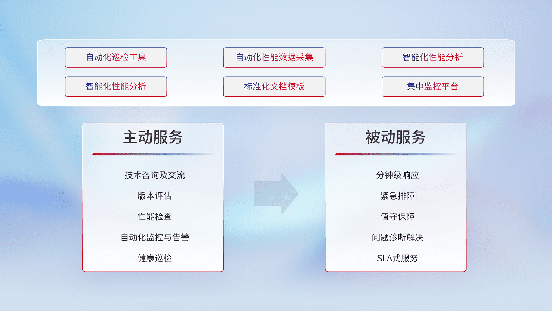 智能化工具和标准化文档,,,,保障服务质量,,提供主动服务(包含技术咨询、、、、版本评估、、、性能检查、、、自动化监控与告警、、健康巡检)和被动服务包含(分钟级响应、、、紧急排障、、、、值守保障、、问题诊断解决、、、、SLA服务)。。。。